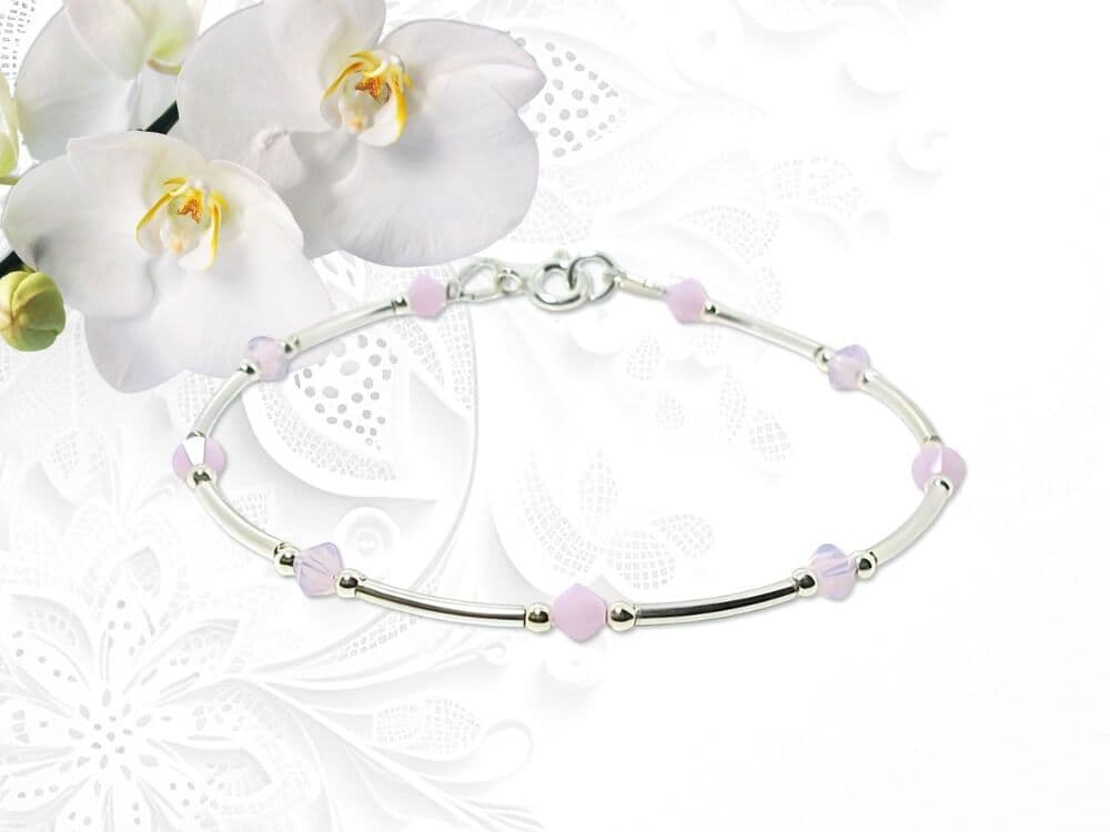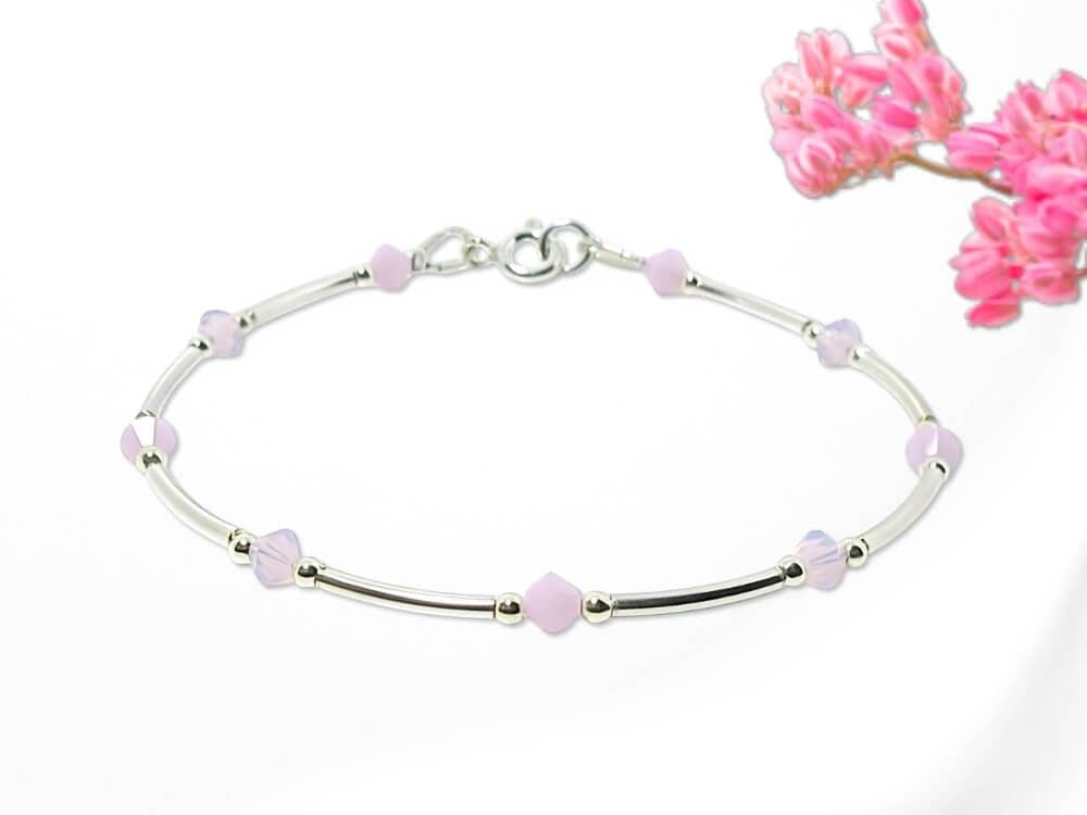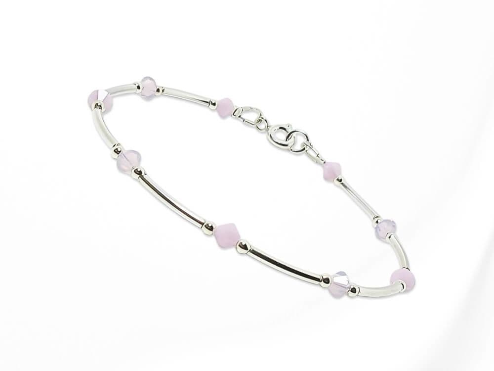 This feminine handmade bracelet features premium pink opal crystals from the world renowned crystal company in Austria. The design is enhanced with small seamless UK .925 Sterling Silver beads and thick curved tubes to form its elegant bangle-style appearance. It is strung on professional jewellery-quality 49-strand beading thread for flexibility and strength and fastens securely with a Sterling Silver bolt ring clasp. Complimentary Silver Polishing Cloth (Please Do Not Wash) included.