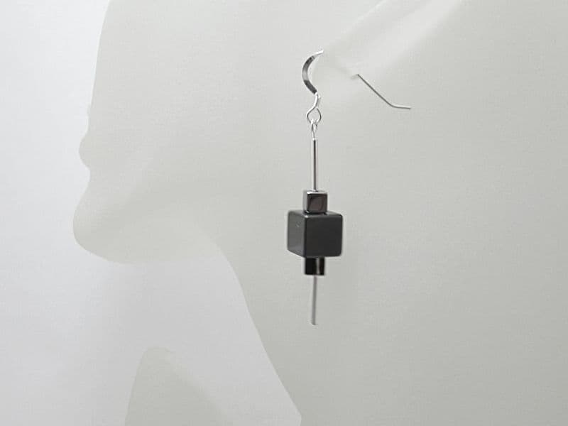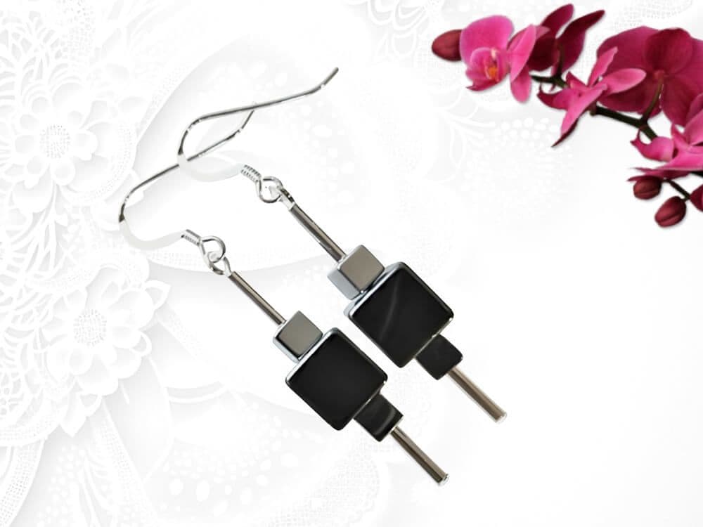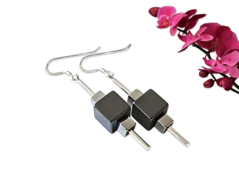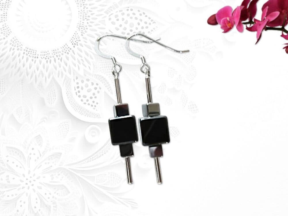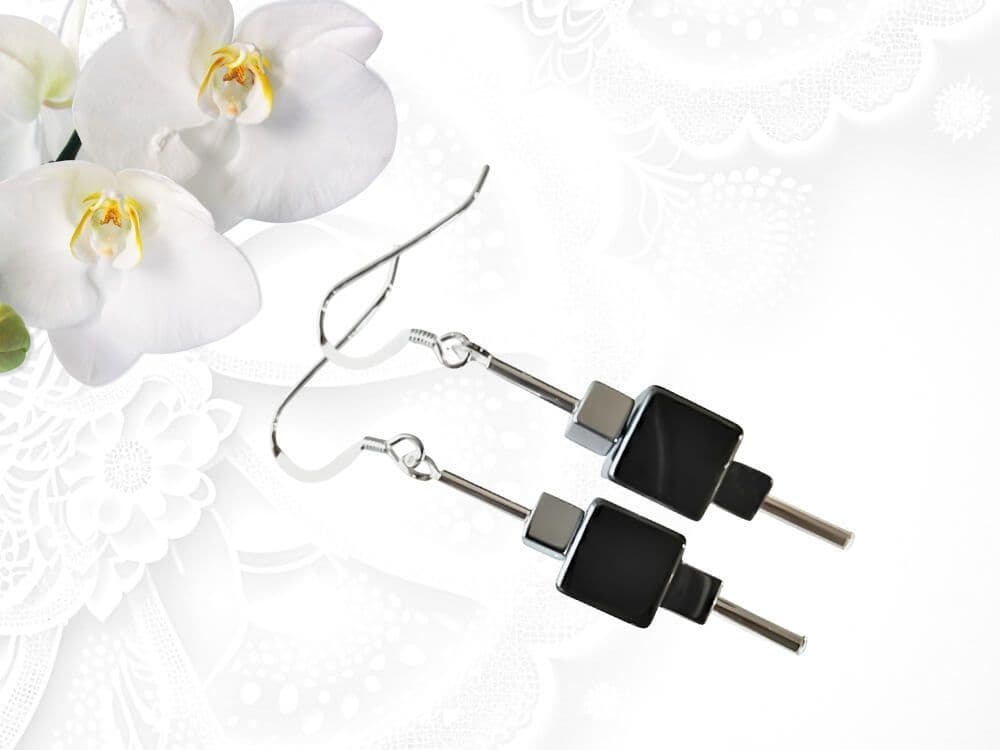 Black & Silver Hematite Cube Beaded Geometric Earrings With Sterling Silver