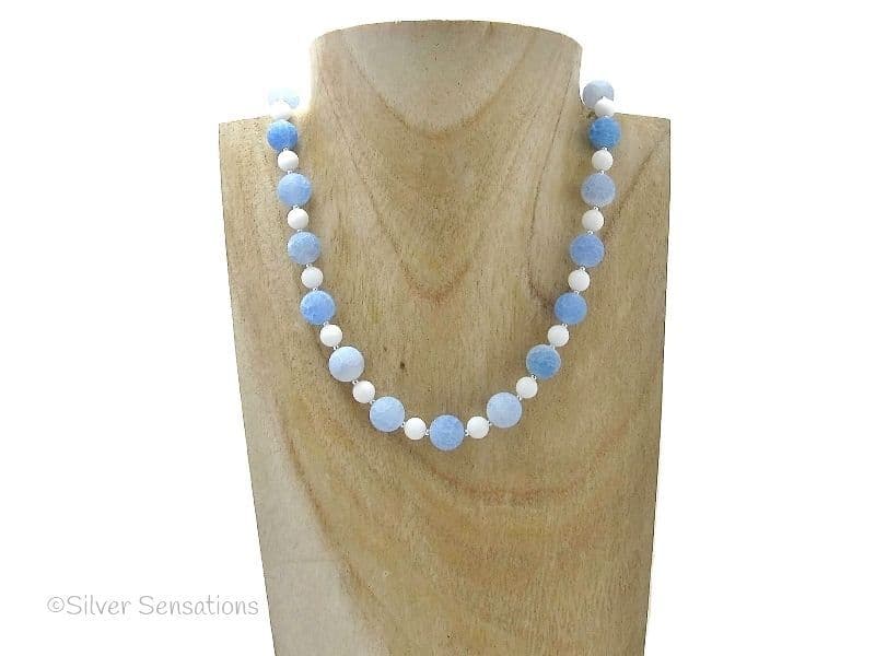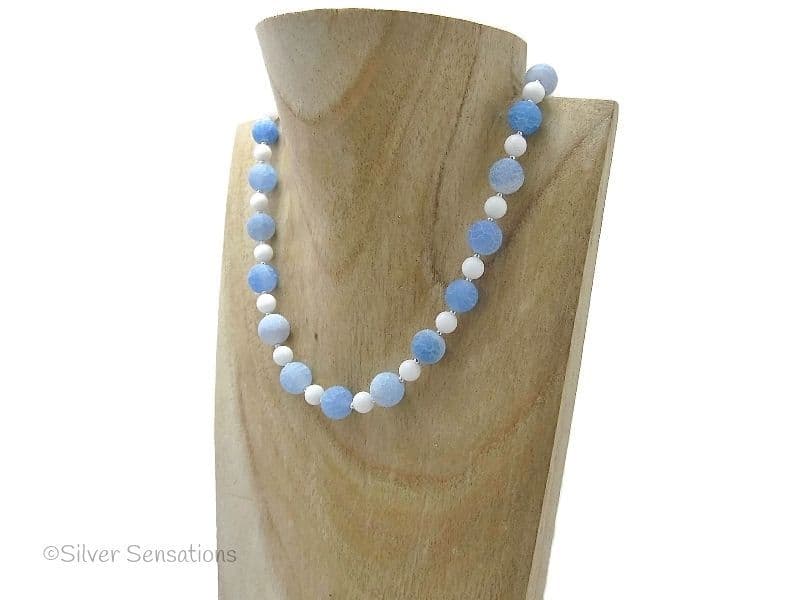 Blue Frosted Cracked Agate, White Jade & Sterling Silver Unique Beaded Necklace