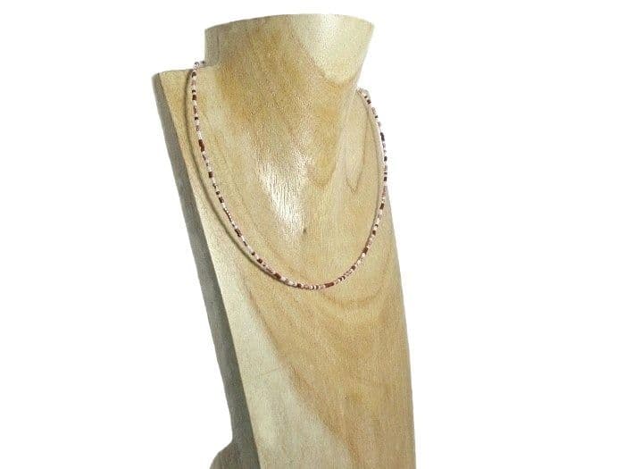 High quality Miyuki Delica seed beads in shades of burgundy red, glossy dusky pink & white make up this ultra slim choker or necklace which is both delicate & pretty.