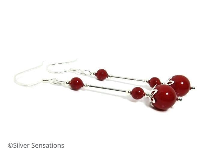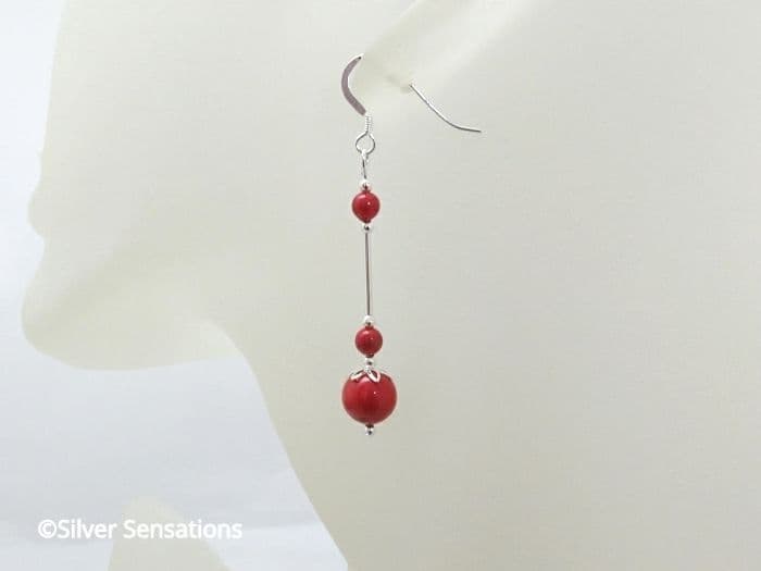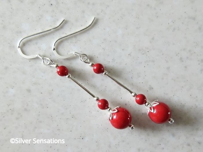 These elegant handmade earrings are crafted with genuine premium pearls from the world renowned crystal company in Austria, featuring an 8 mm red pearl with two 4 mm matching premium pearls above it. All metal components — including the seamless beads, tubes, bead caps, headpins and hallmarked ear wires — are genuine UK .925 Sterling Silver. Complimentary rubber backs and a complimentary Silver Polishing Cloth (Do Not Wash) are included.