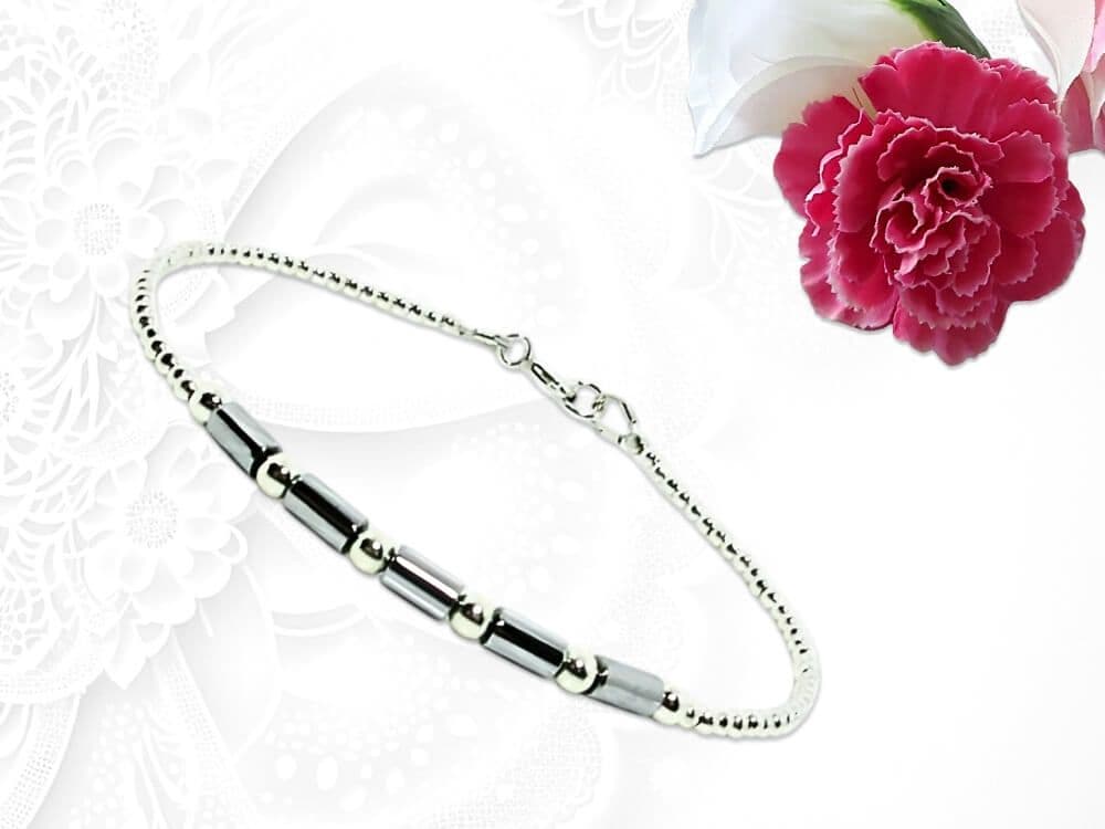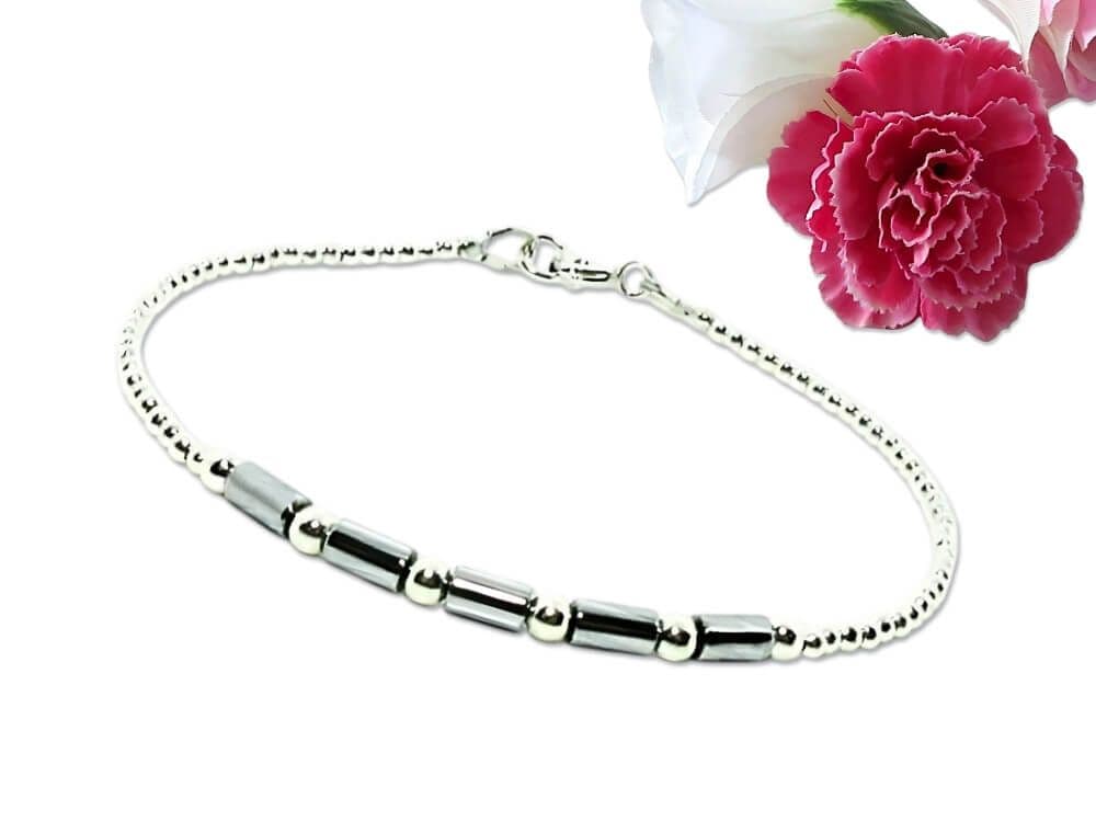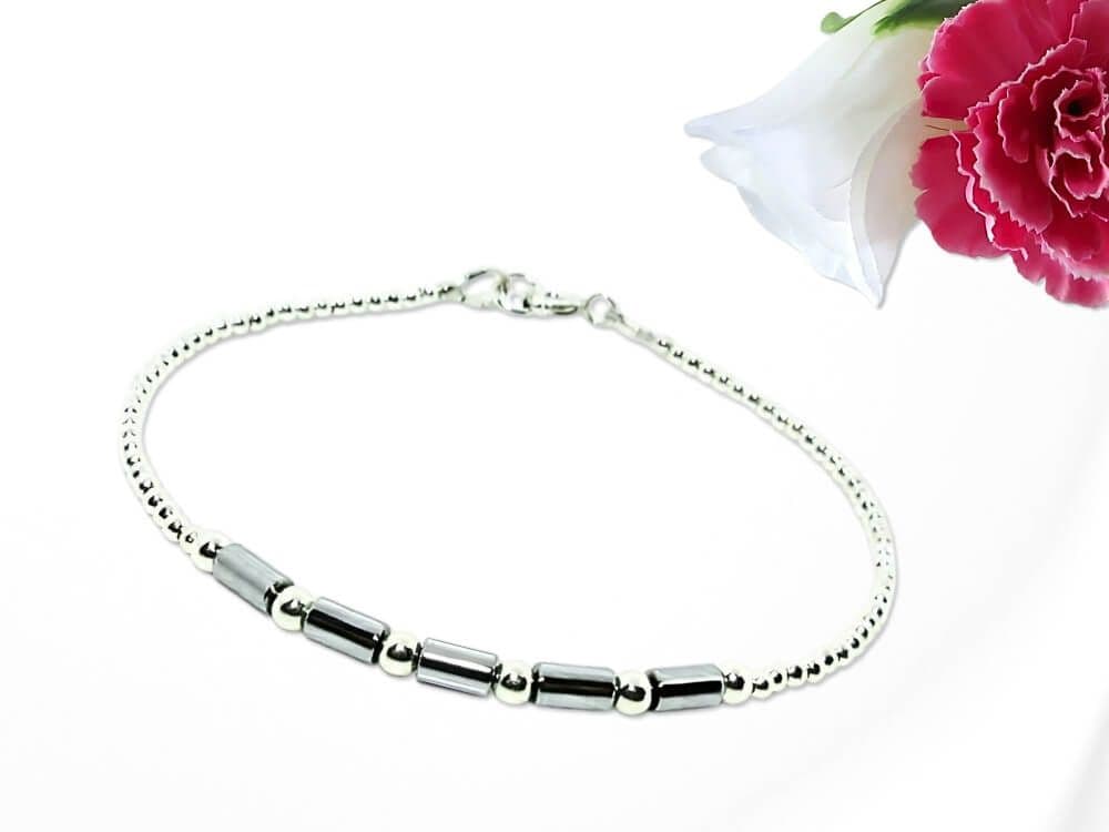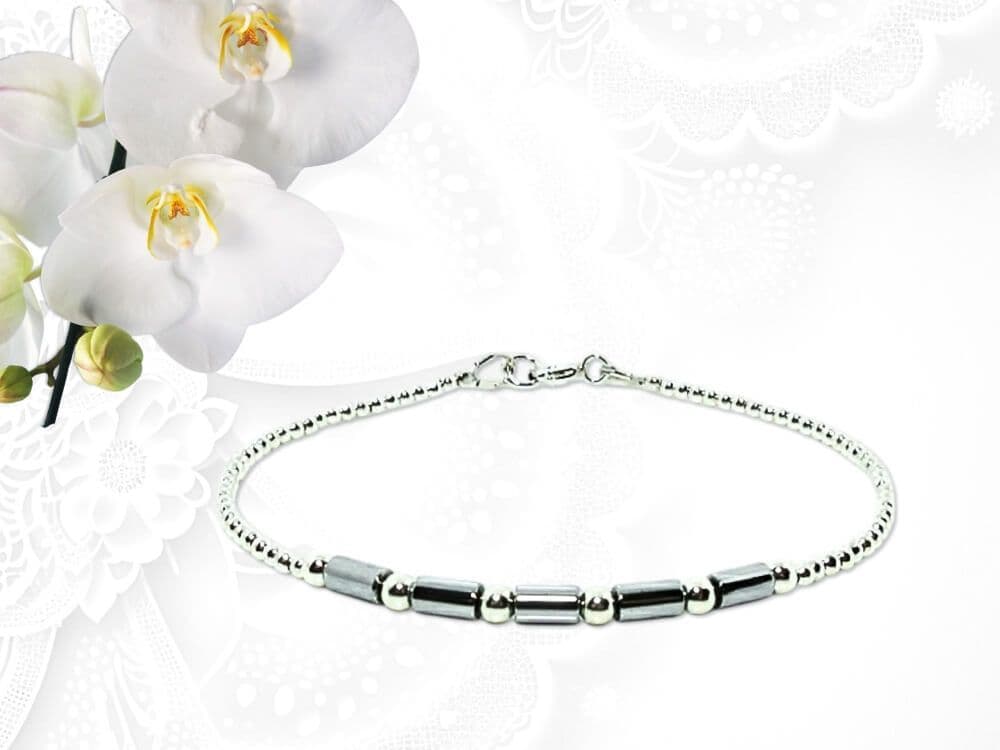 At the front sit five bright silver-plated non magnetic Hematite tube gemstones, each a delicate 5mm x 3mm. Their sleek ombré look is framed with 3mm Sterling Silver seamless beads, followed by tiny 2mm seamless .925 Sterling Silver round beads that complete the bracelet with a smooth, contemporary finish.
