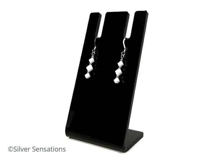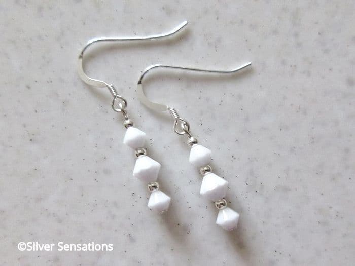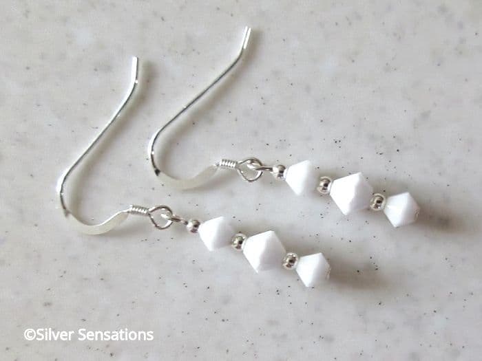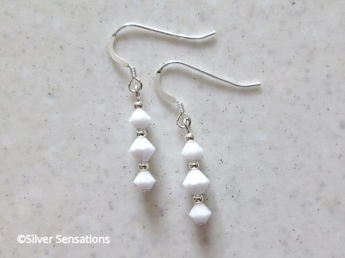 These earrings are handmade using genuine premium quality white crystals from the world renowned crystal company in Austria. Each crystal is spaced with seamless Sterling Silver round beads and threaded onto strong UK .925 Sterling Silver headpins. They hang from high-quality Sterling Silver ear wires. A complimentary anti-tarnish tab and rubber backs are also included.