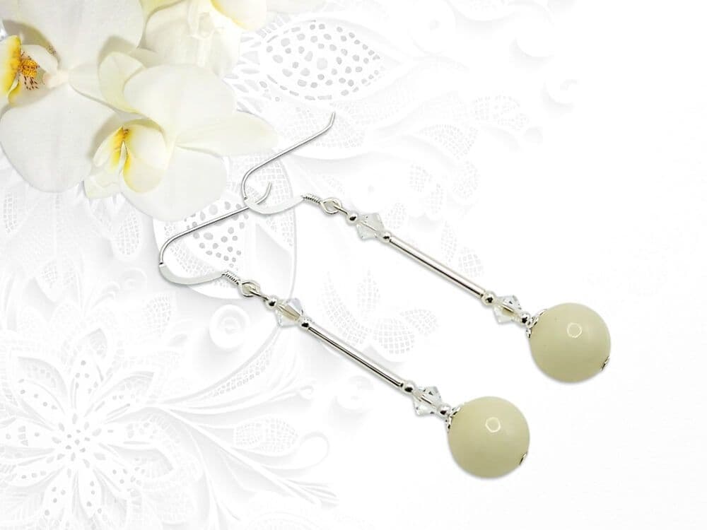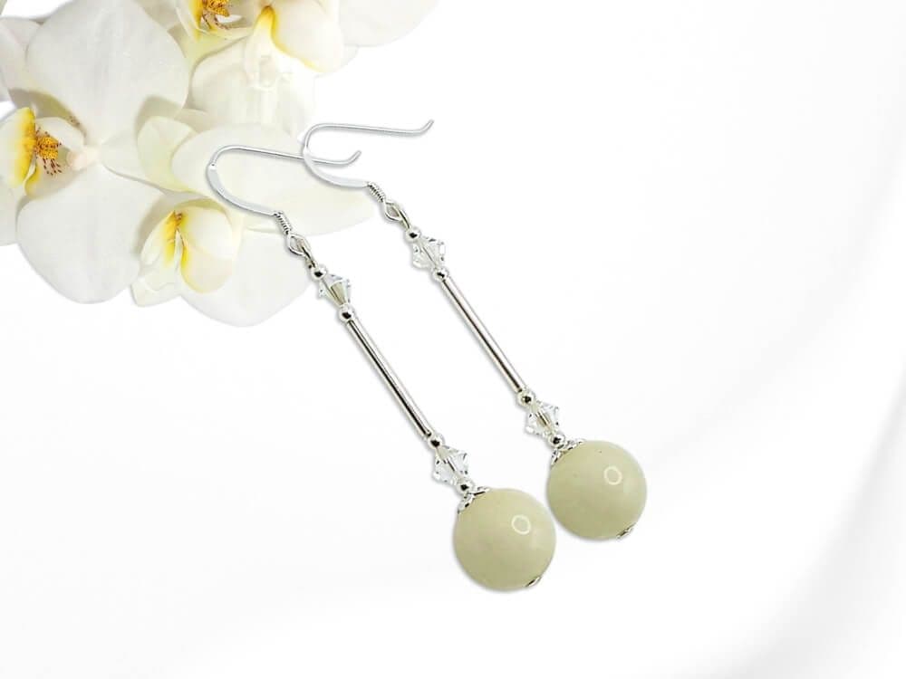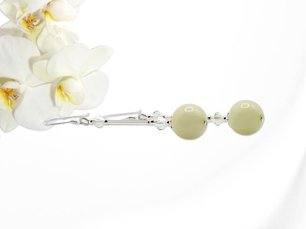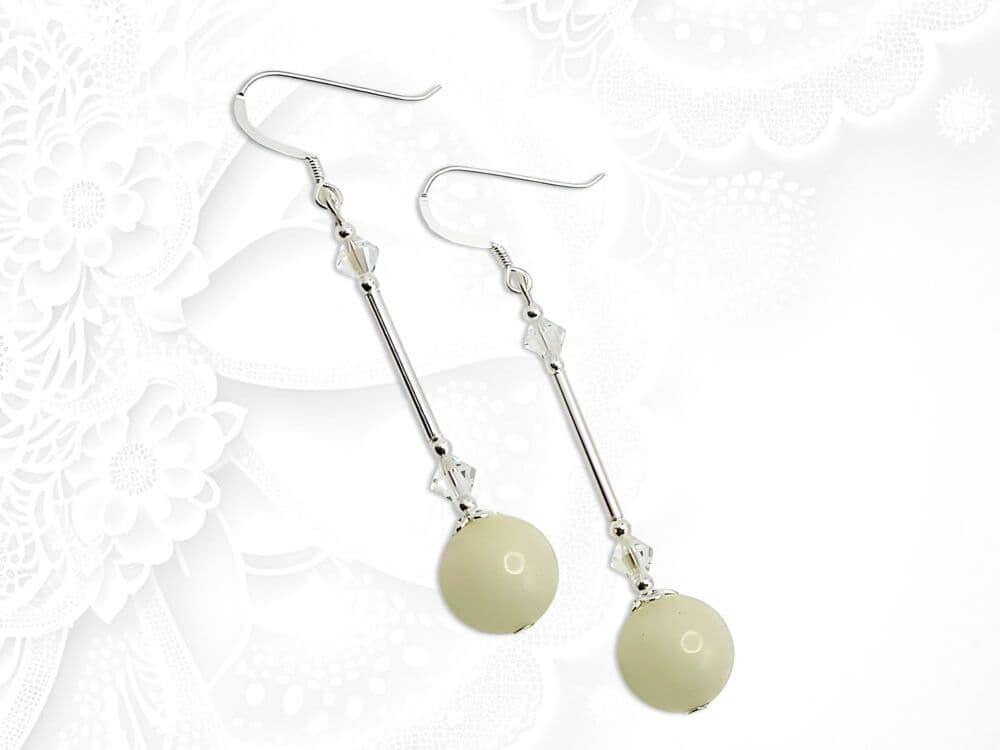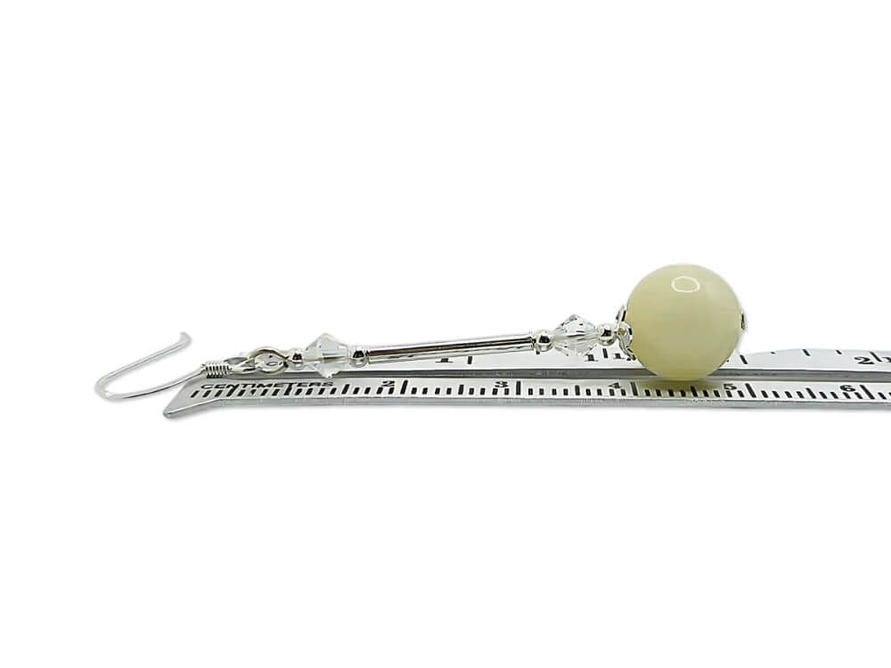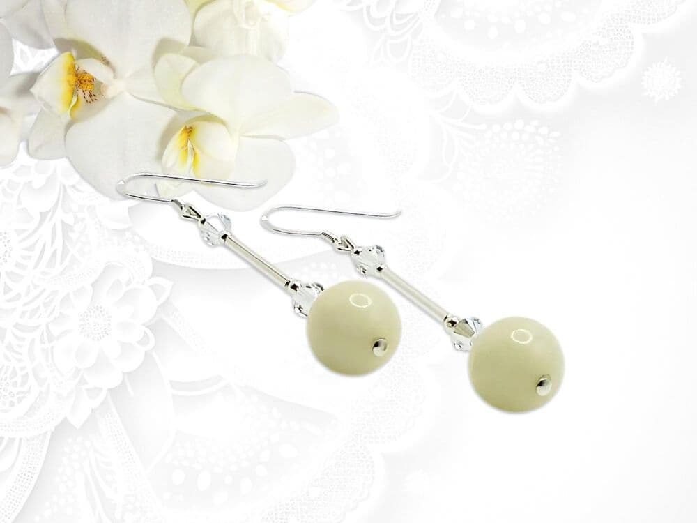 I designed & handmade these limited edition dangly earrings with beautiful pastel lemon yellow Quartzite 8mm round beads. This soft pastel lemon shade is highlighted by the contrasting shiny Sterling Silver tubes. Adding small seamless Sterling Silver beads, elegantly shaped bead caps & sparkling premium quality crystals from Austria complete this unique design. Wear these elegantly feminine earrings to show off your individuality.