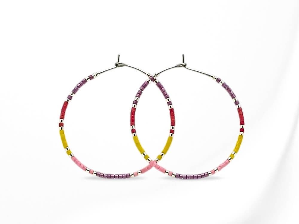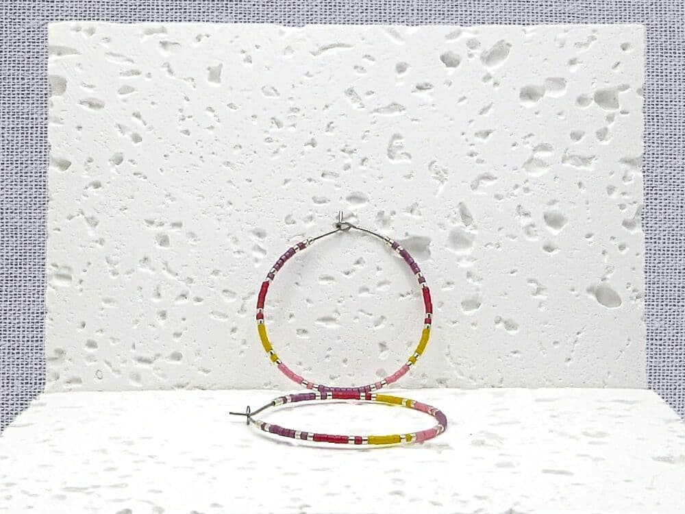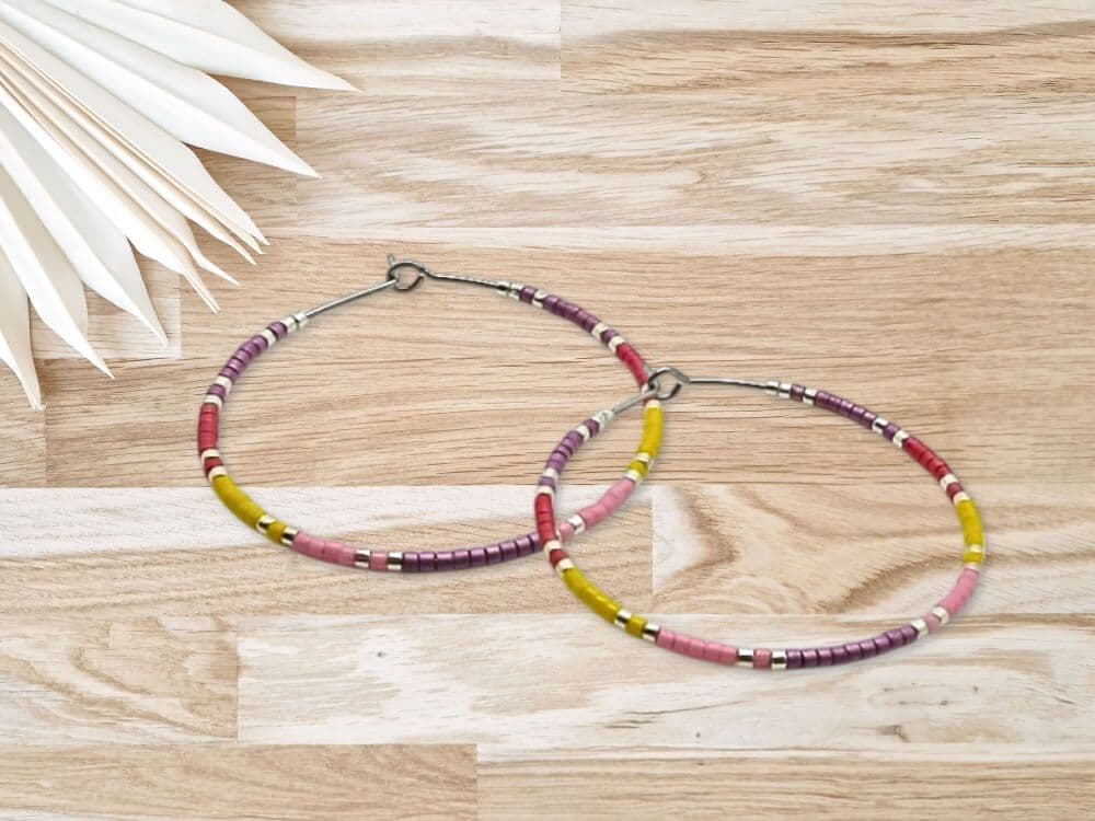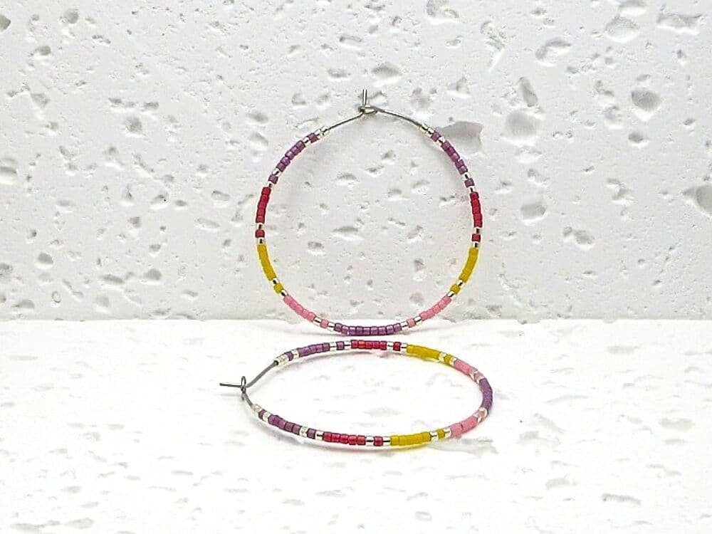 Not only are these hoop earrings a fashion statement, but they also make a meaningful friendship or birthday gift for friends & loved ones. This stunning combination of purple, pink, yellow ochre, red & silver seed beads adds a pop of colour to any outfit. Available in sizes 20mm, 25mm, 30mm, 35mm, and 40mm, you can choose the perfect fit for your personal style. The earrings in the photos are 40mm Stainless Steel.