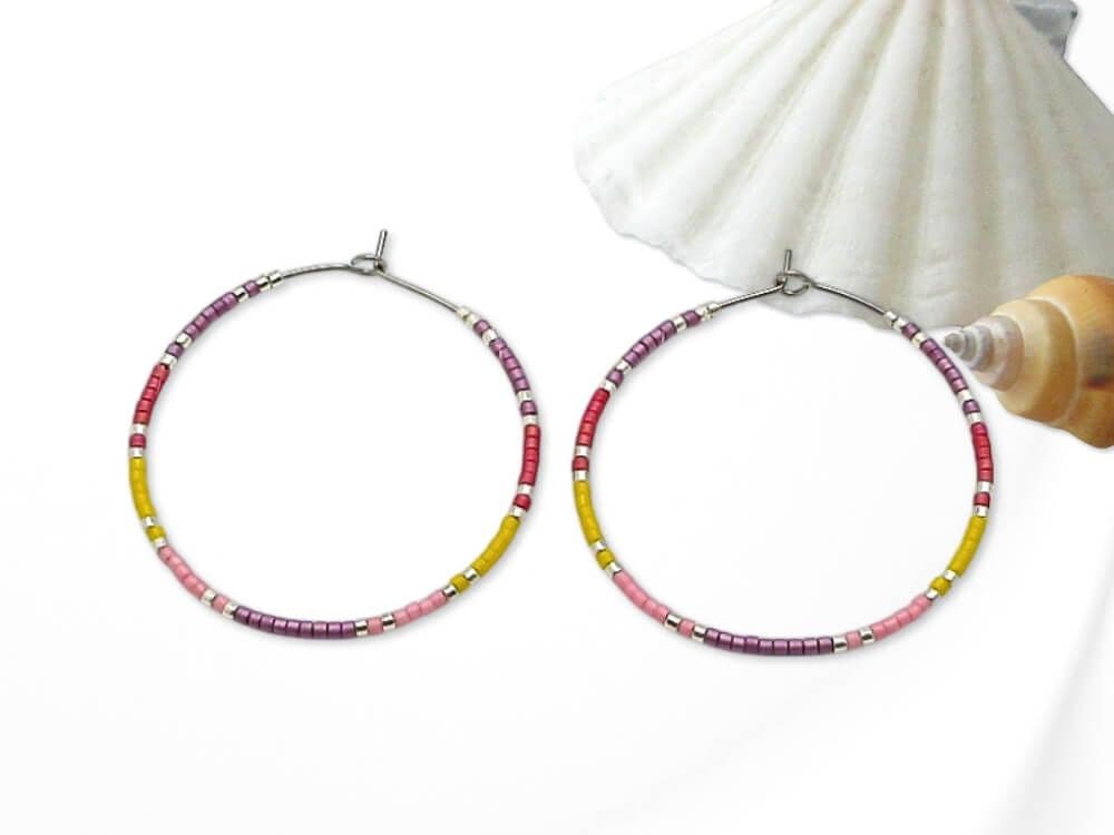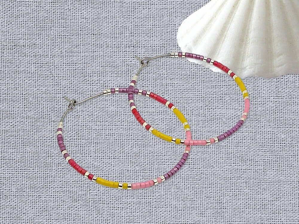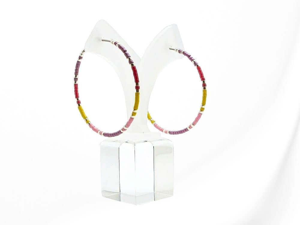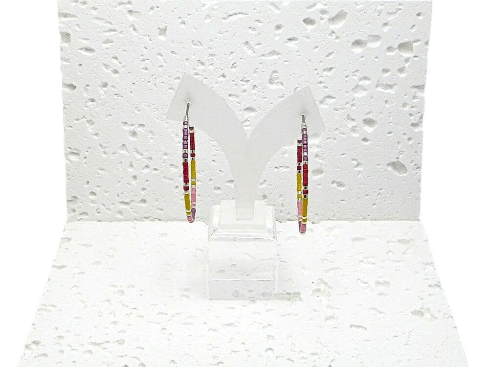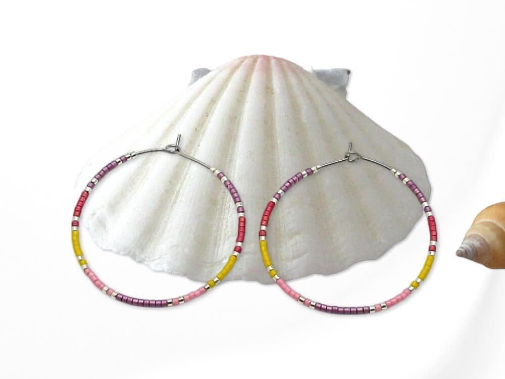 Not only are these hoop earrings a fashion statement, but they also make a meaningful friendship or birthday gift for friends & loved ones. This stunning combination of purple, pink, yellow ochre, red & silver seed beads adds a pop of colour to any outfit. Available in sizes 20mm, 25mm, 30mm, 35mm, and 40mm, you can choose the perfect fit for your personal style. The earrings in the photos are 40mm Stainless Steel.