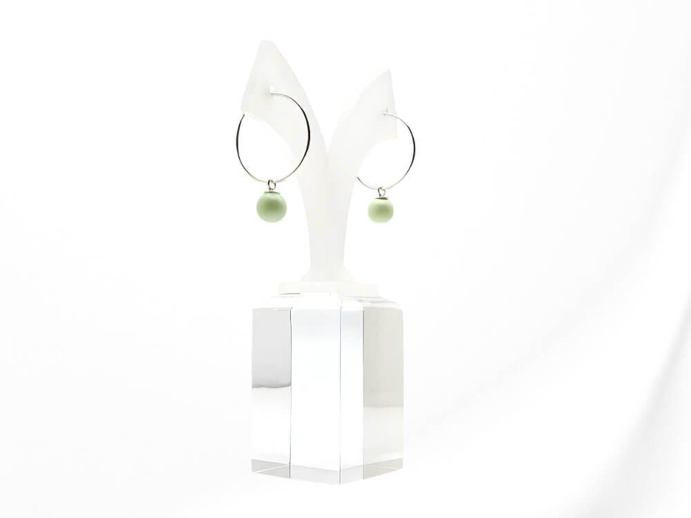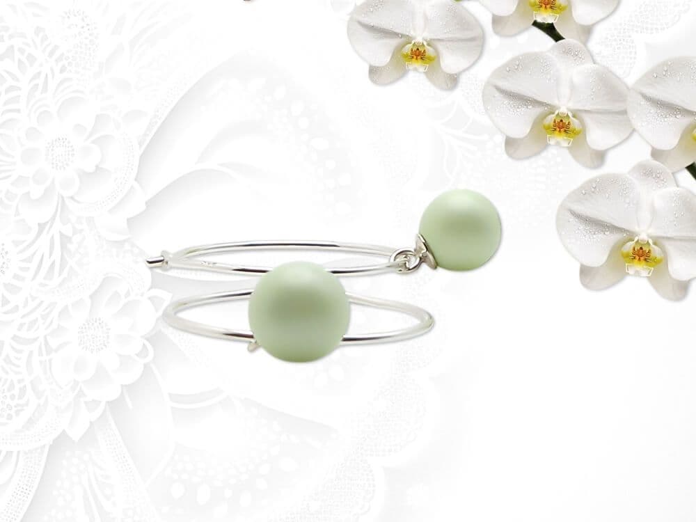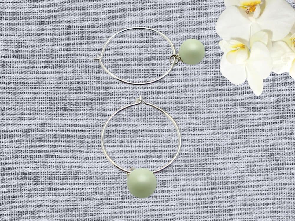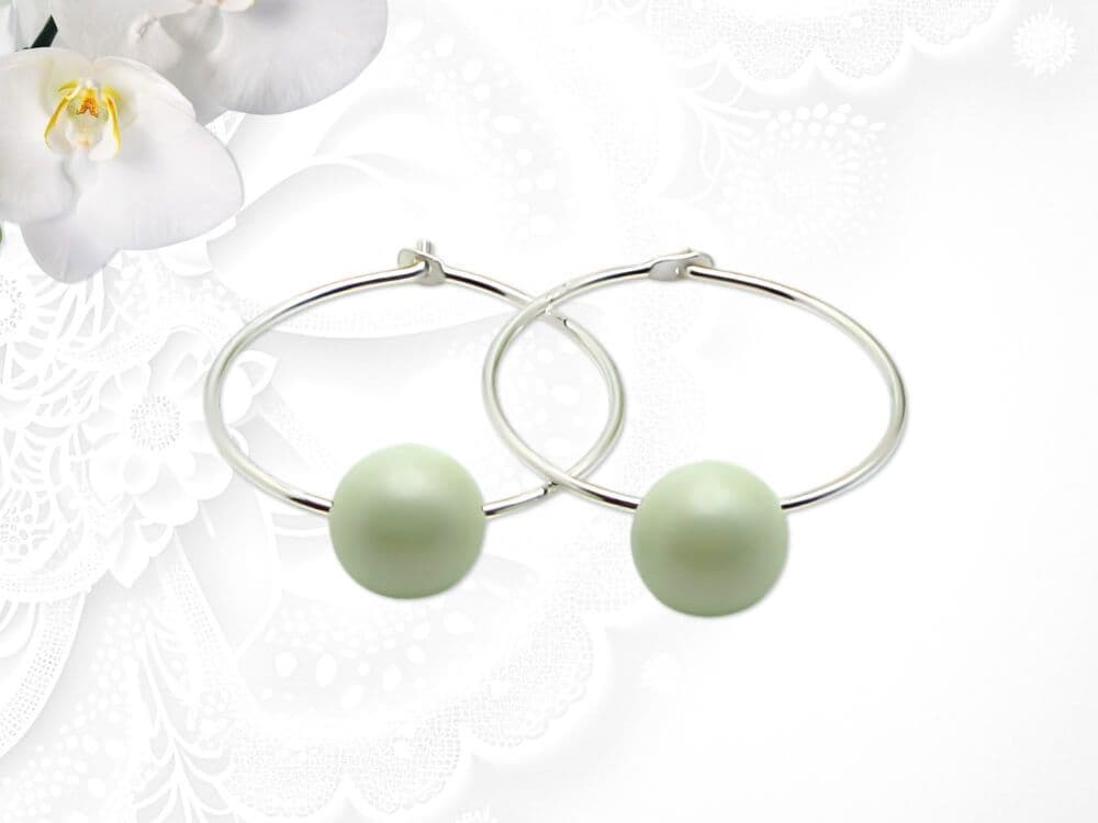 These feminine handmade hoop earrings feature genuine 6mm crystal pearls from the world-respected Austrian manufacturer. Each pearl is a delicate pastel green and is fitted with a solid Sterling Silver pendant bail, allowing the pearls to swing freely on slim, stylish Sterling Silver hoops.