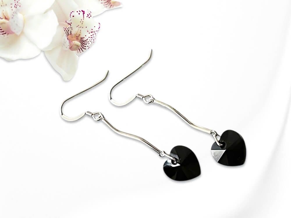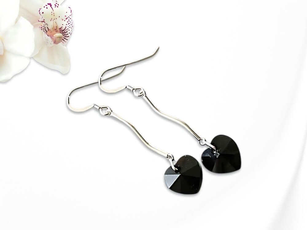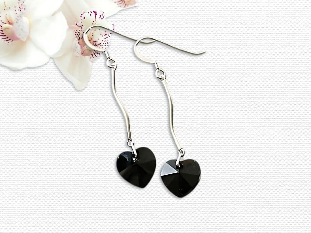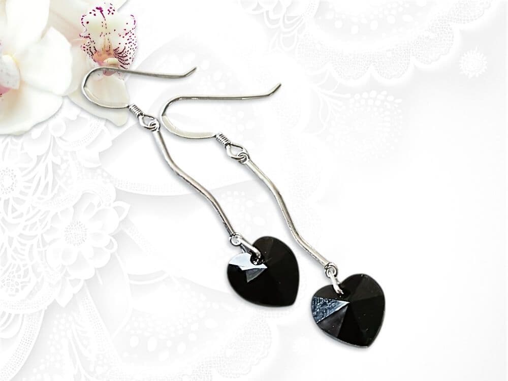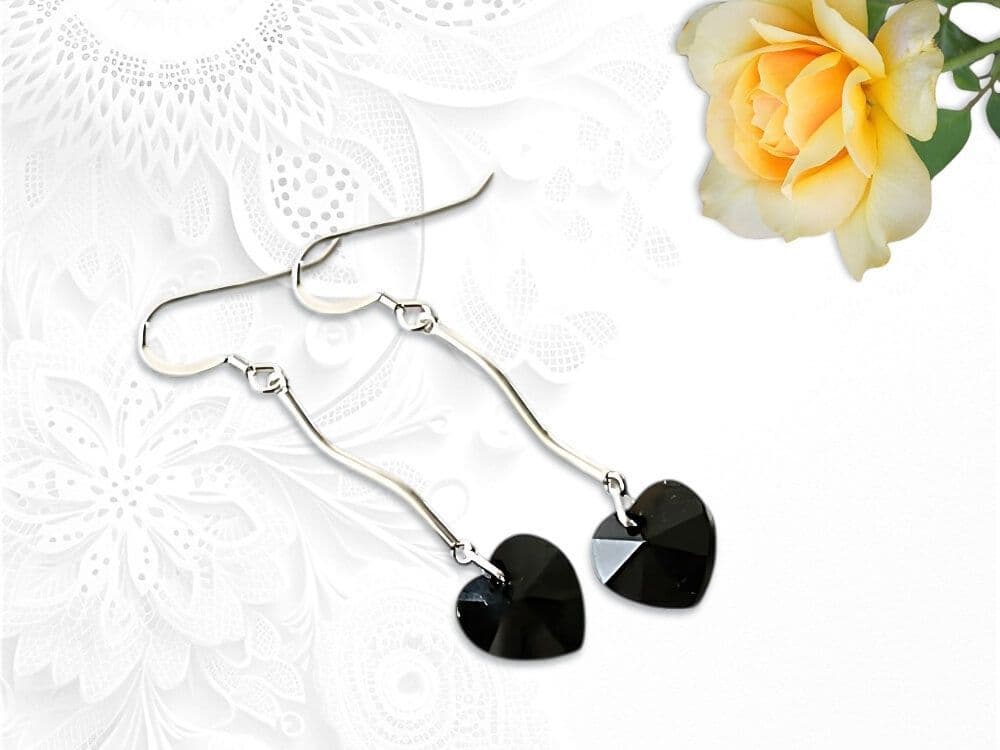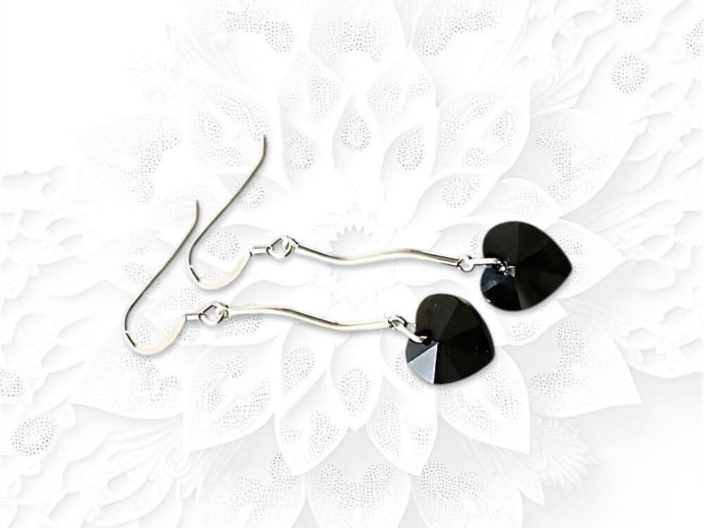 Make a dramatic, elegant statement with these long, handmade ladies earrings. They feature beautifully sleek 10mm jet black, faceted heart-shaped crystals sourced from the world - famous crystal company.