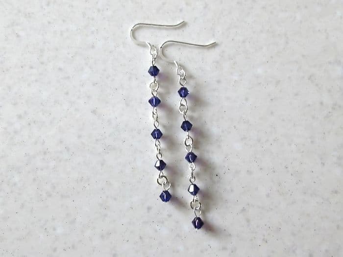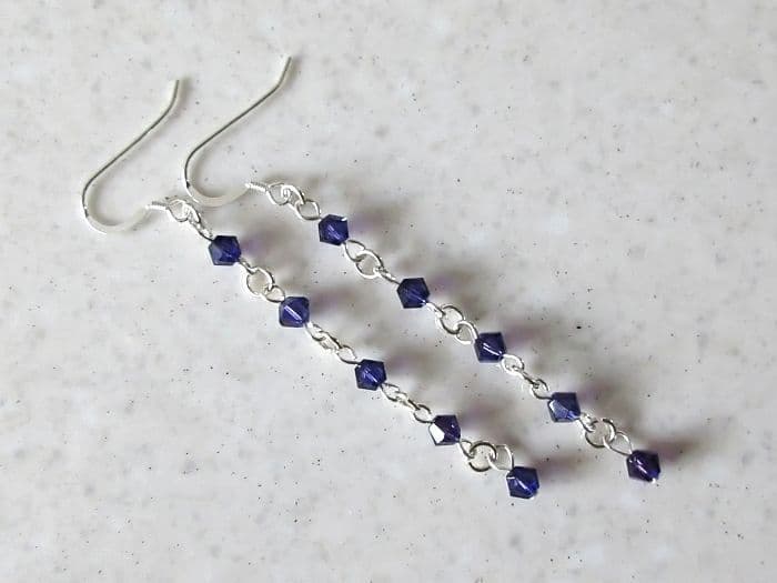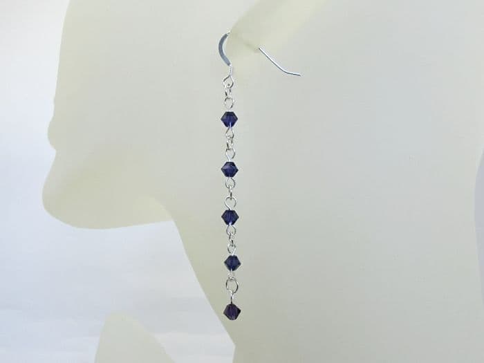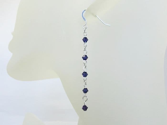 These elegant chain earrings are handmade using premium quality purple crystals from the world respected crystal company in Austria. Each earring features five crystals linked together using genuine UK .925 Sterling Silver wire and jump rings, creating a delicate chain design. They hang from high quality Sterling Silver ear wires and include complimentary rubber backs for added security.