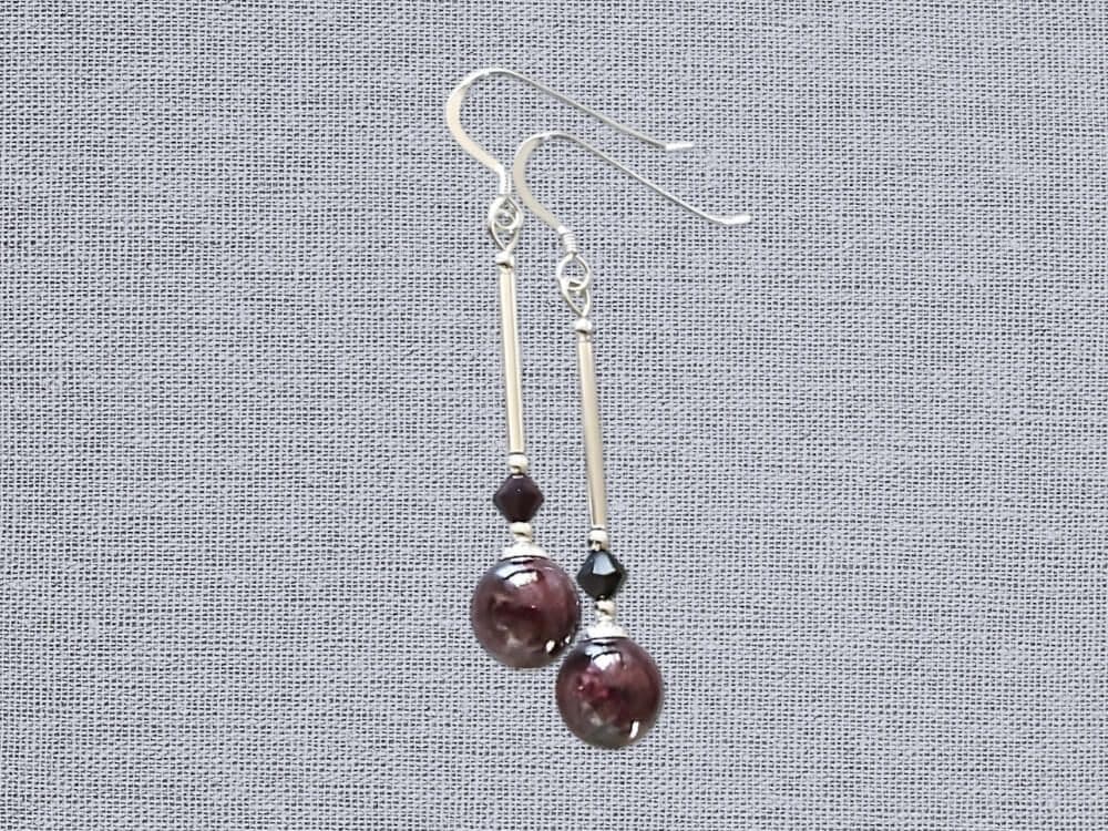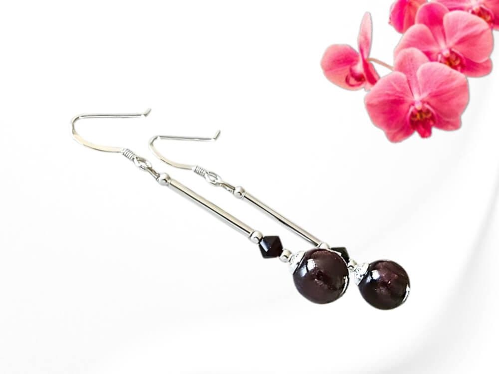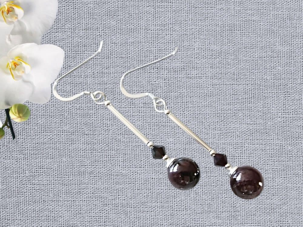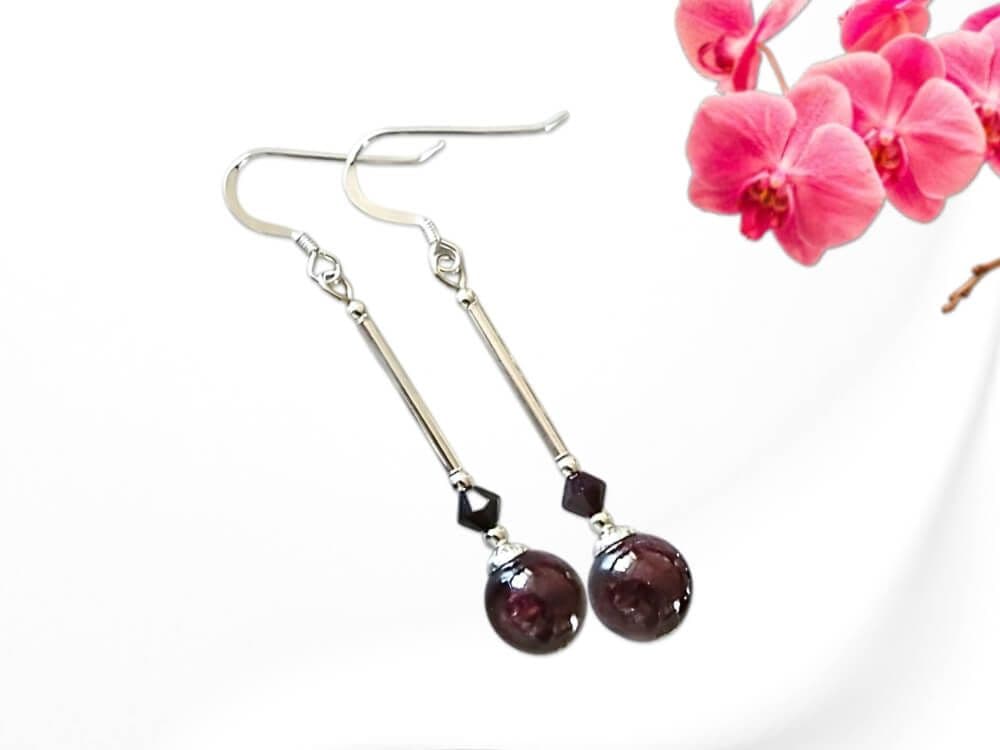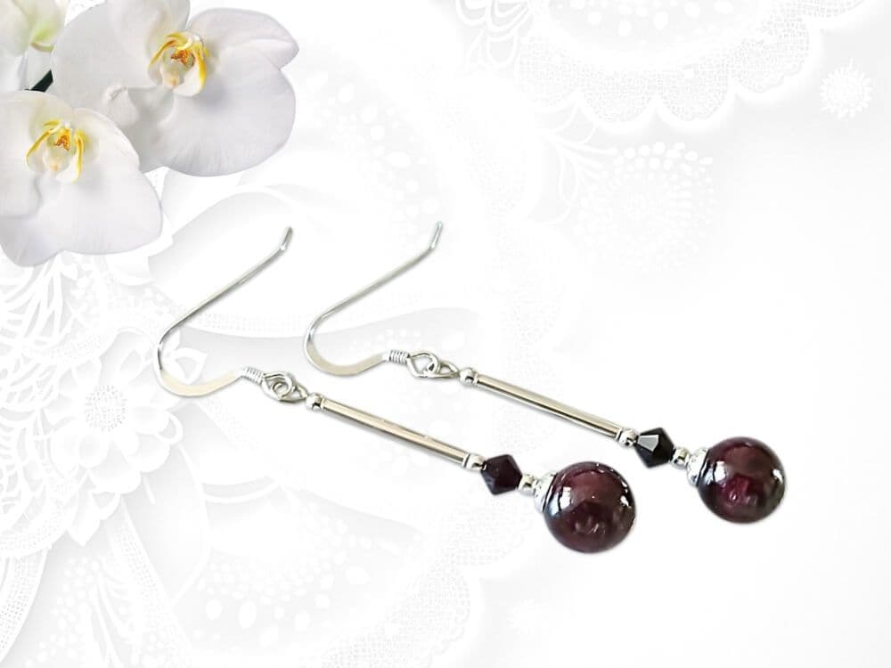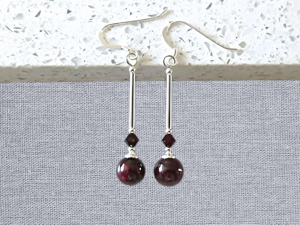 Exude elegance with these stunning, handmade ladies' earrings, featuring the deep, rich colour of natural dark red Garnet semi precious gemstones. The design is enhanced with matching premium quality crystals from Austria and shiny Sterling Silver small seamless beads and tubes.