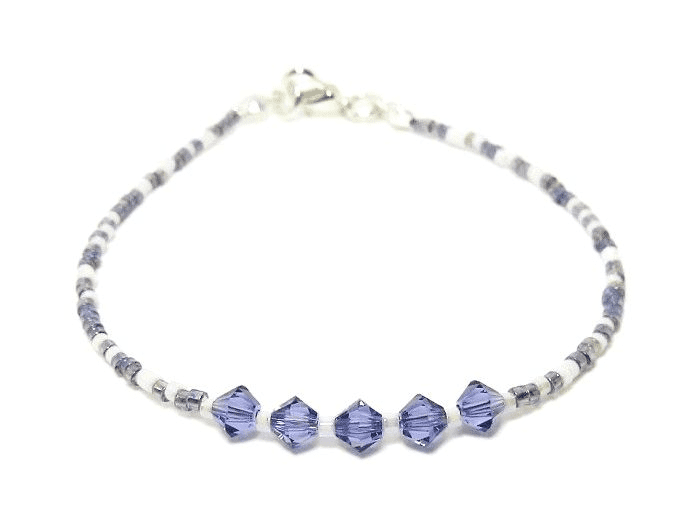 This elegant handmade bracelet is crafted using premium quality crystals from the world renowned crystal company in Austria, in a beautiful tanzanite shade of purple. Tiny 1.8mm Miyuki Delica seed beads perfectly complement the crystals, creating a delicate boho-inspired look. It is finished with a choice of plated lobster clasp and fittings, made using materials that are lead and nickel free for comfort and durability.